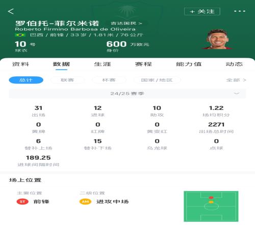 在亞冠奪冠之后,吉達國民本賽季只剩5場(chǎng)聯(lián)賽要踢,而菲爾米諾此前因為注冊限制被吉達國民排除出聯(lián)賽名單,也就是說(shuō),年薪2000萬(wàn)歐的菲米本賽季已經(jīng)提前放假,他的賽季數據為31場(chǎng)12球10助攻。